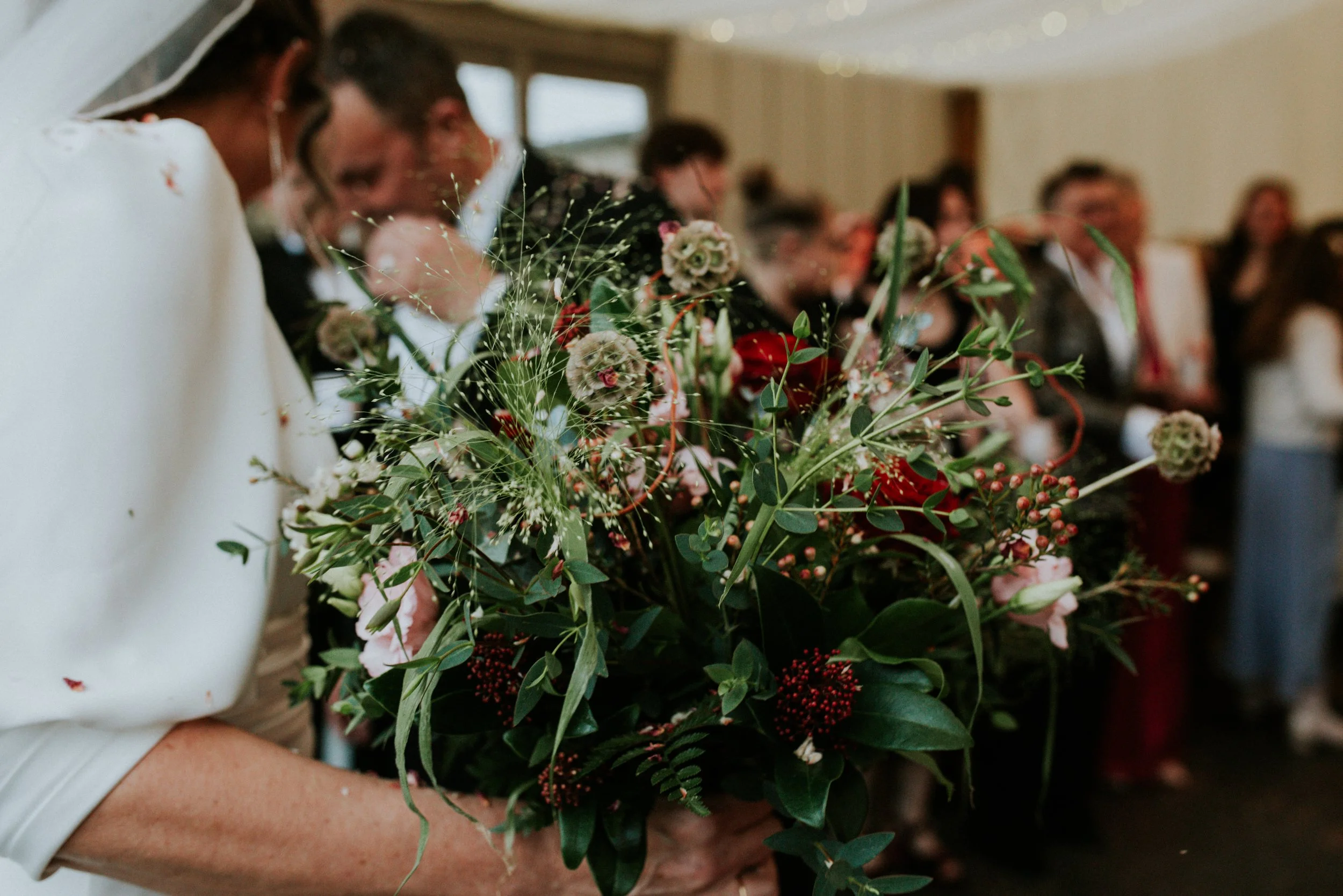 From the bouquets to the table arrangements, everything was designed to complement Trevenna’s natural charm. Think velvety roses, trailing greenery, and winter berries, adding colour and life against the soft candlelight and rustic interiors.