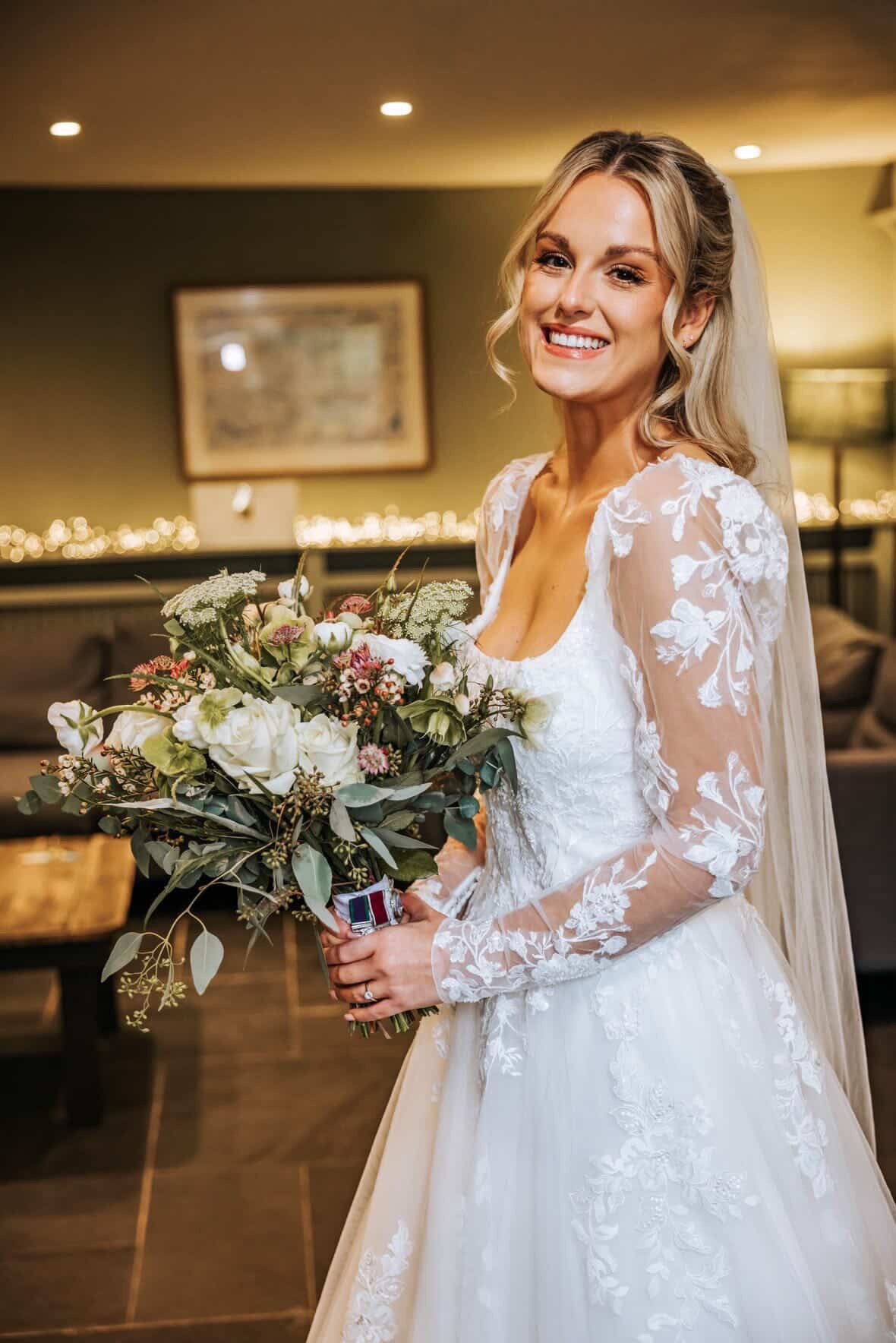 What meant the most to me was how thoughtfully you incorporated all of my sentimental touches. The lace from my mum’s wedding dress, my ‘something blue’ locket with forget-me-nots with my grandma’s photo inside and my grandad’s army medals. Having those with me on my bouquet throughout the day meant the world to me and my family.